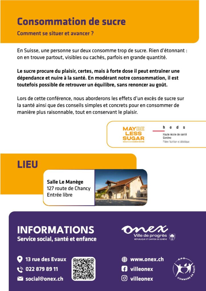 Notre conférencière, Madame Delphine Amstutz, Maître d’enseignement à la Haute École de Santé de Genève – Filière nutrition et diététique, abordera les effets d’un excès de sucre sur la santé et donnera des conseils simples et concrets pour en consommer de manière plus raisonnable, tout en conservant le plaisir. A l’issue de la conférence des rafraichissements et une collation seront offertes au public.